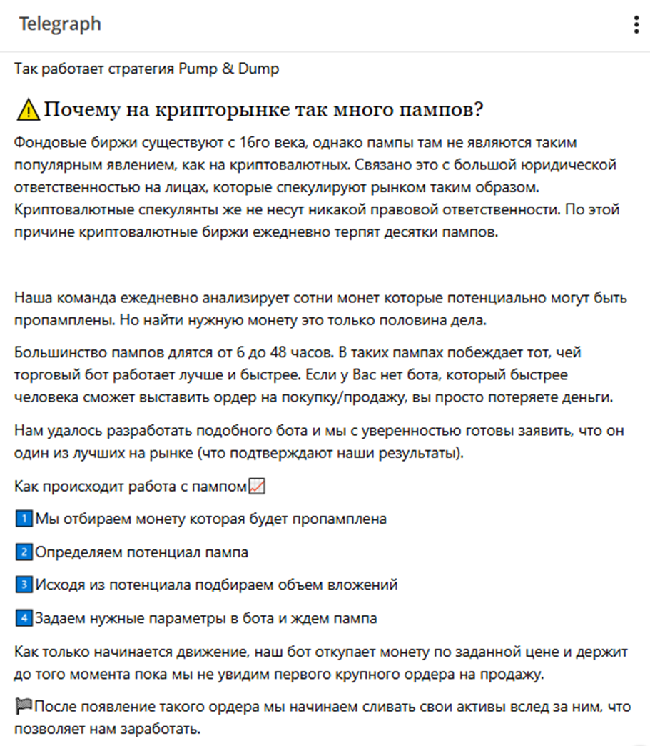 Создатель проекта позиционирует себя успешным трейдером и лидером команды опытных криптовалютных экспертов, работающих по беспроигрышной торговой стратегии Pump And Dump. Метод предполагает инвестирование в малоизвестный токен с последующим созданием искусственного ажиотажа. Продажа по пиковой цене позволяет фиксировать солидный доход без особых финансовых рисков.