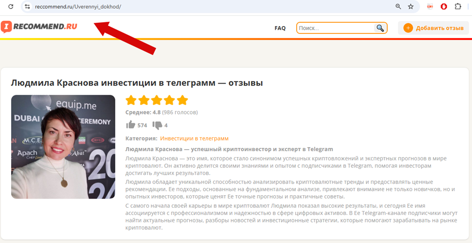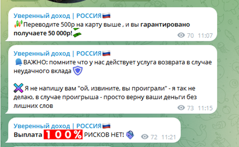 «Уверенный доход Россия» — информационный телеграмм-канал трейдера Людмилы. В нем публикуют настойчивые предложения быстрого пассивного заработка. Мы разобрались, насколько полезны инвестиционные услуги проекта и предлагаем познакомиться с экспертным мнением нашей редакции.
