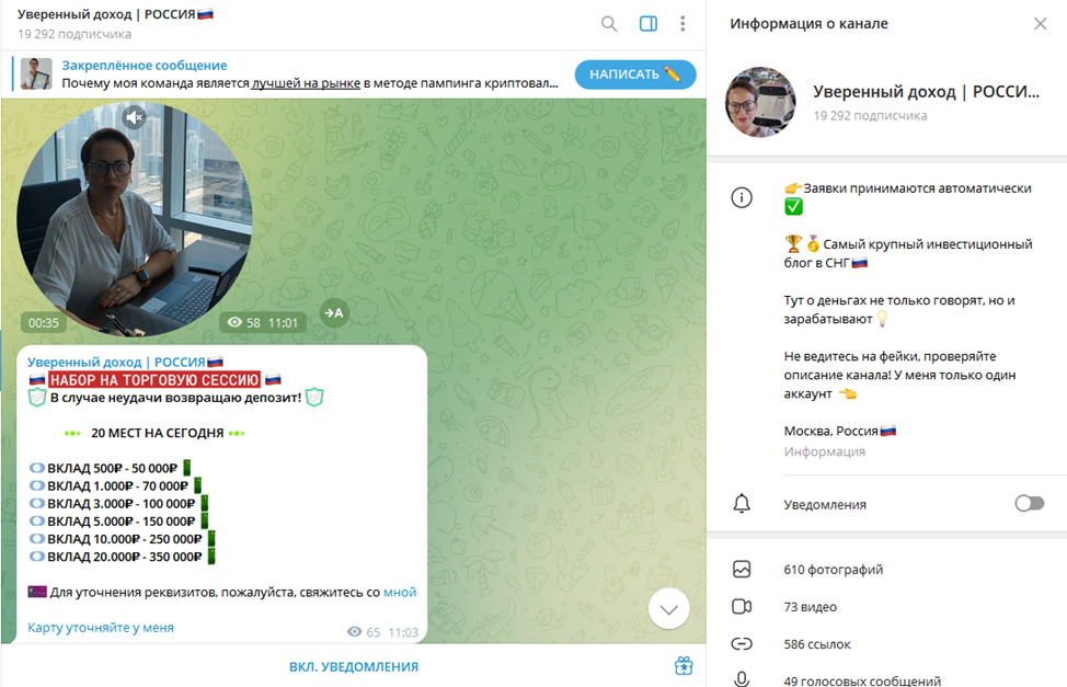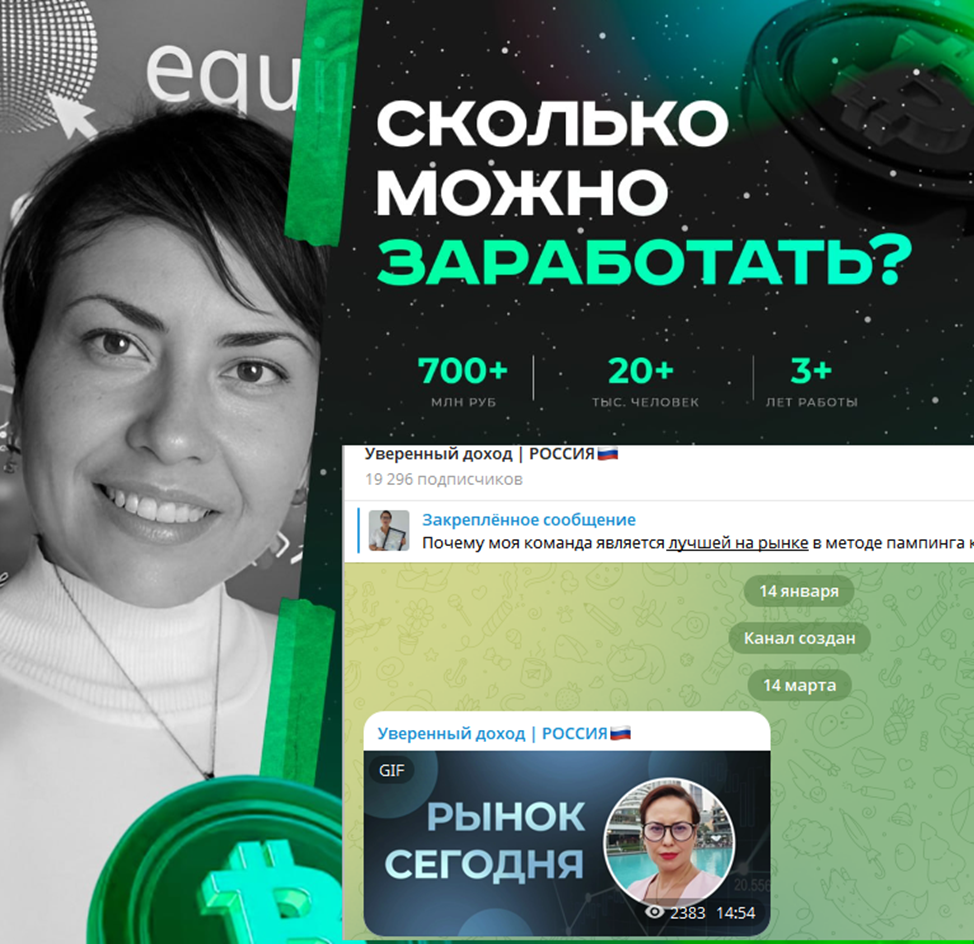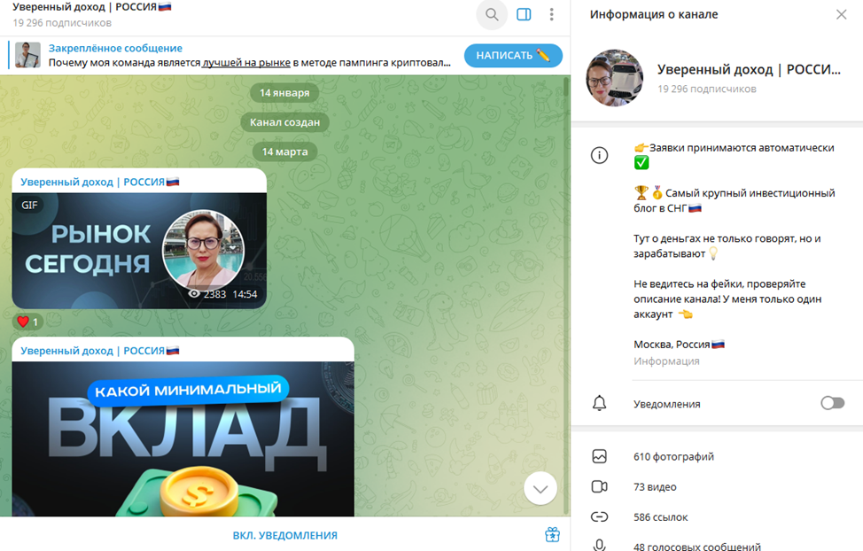Согласно представленной автором статистике, «социальный проект» работает более 3 лет. За этот период трейдер для 20 тыс. человек заработала более 700 млн рублей. По факту, телеграм-канал «Уверенный доход Россия» создан только 14 января 2025 года.