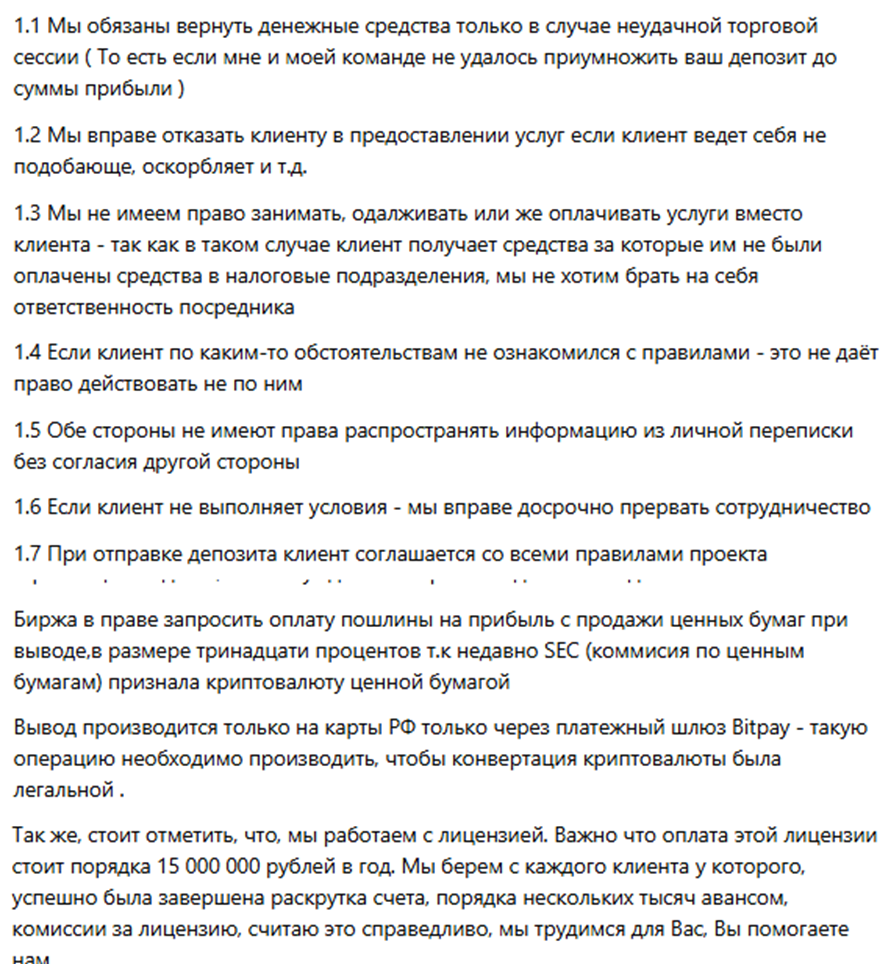 Здесь прописаны кабальные условия, дающие право блокировать пользователя без объяснения причины, а также вымогать дополнительные деньги за оплату страховки, лицензии, налогов, другие мнимых услуг и сборы.