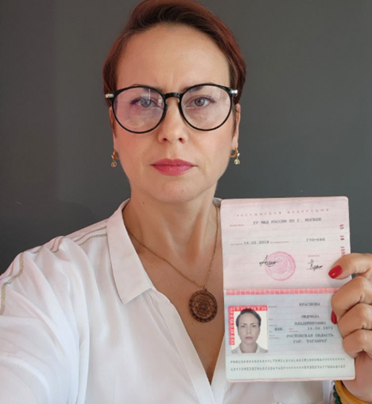 Под псевдонимом «Инвест Людмила» скрывается женщина по имени Людмила Краснова. На одном из фото она позирует вместе с российским паспортом. Номер документа предусмотрительно закрыт пальцами, что исключает возможность его проверки на подлинность.