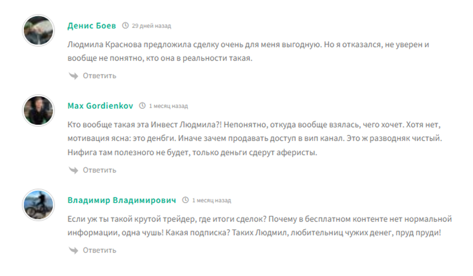 В отзывах бывшие клиенты @ Investludmila рассказывают, что их заранее не предупреждали о бесконечных авансовых взносах, иначе они бы сразу поняли, что это мошенники.