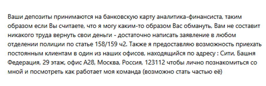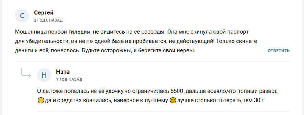 Один из пользователей пишет, что повелся на шарм и открытость организатора схемы. Людмила предоставила в личке копию документов, а также спокойно и последовательно рассказывала о преимуществах взаимовыгодного сотрудничества. Результат — полная потеря первичного депозита и нескольких платежей, якобы за оплату страховки и лицензии.