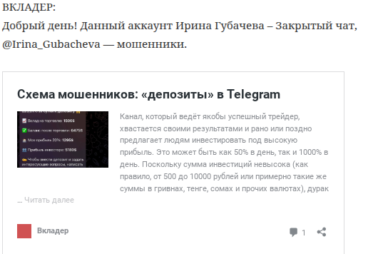 Помимо этого, пользователь описал, что Ирина предлагает раскрутку счета. Под видом инвестиционной помощи Irina Gubacheva забирает у клиентов последние деньги.