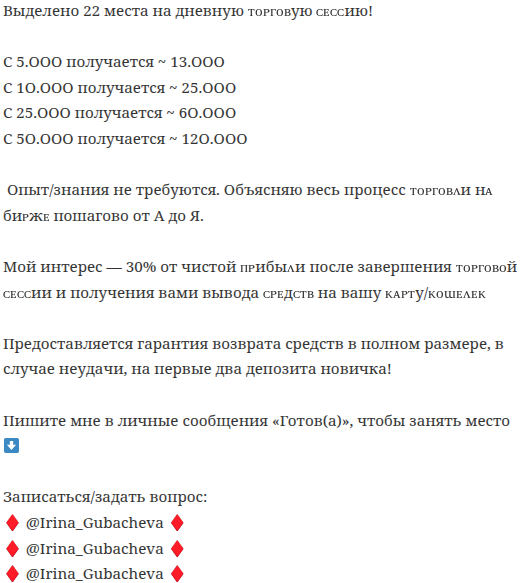 Irina Gubacheva каждый день в паблике сообщает о наличии мест в команде по заработку. Чтобы создать ажиотаж, Ирина пишет, что количество слотов ограничено и надо поторопиться. Однако, на самом деле это уловка, дабы подстегнуть пользователей к активному сотрудничеству.