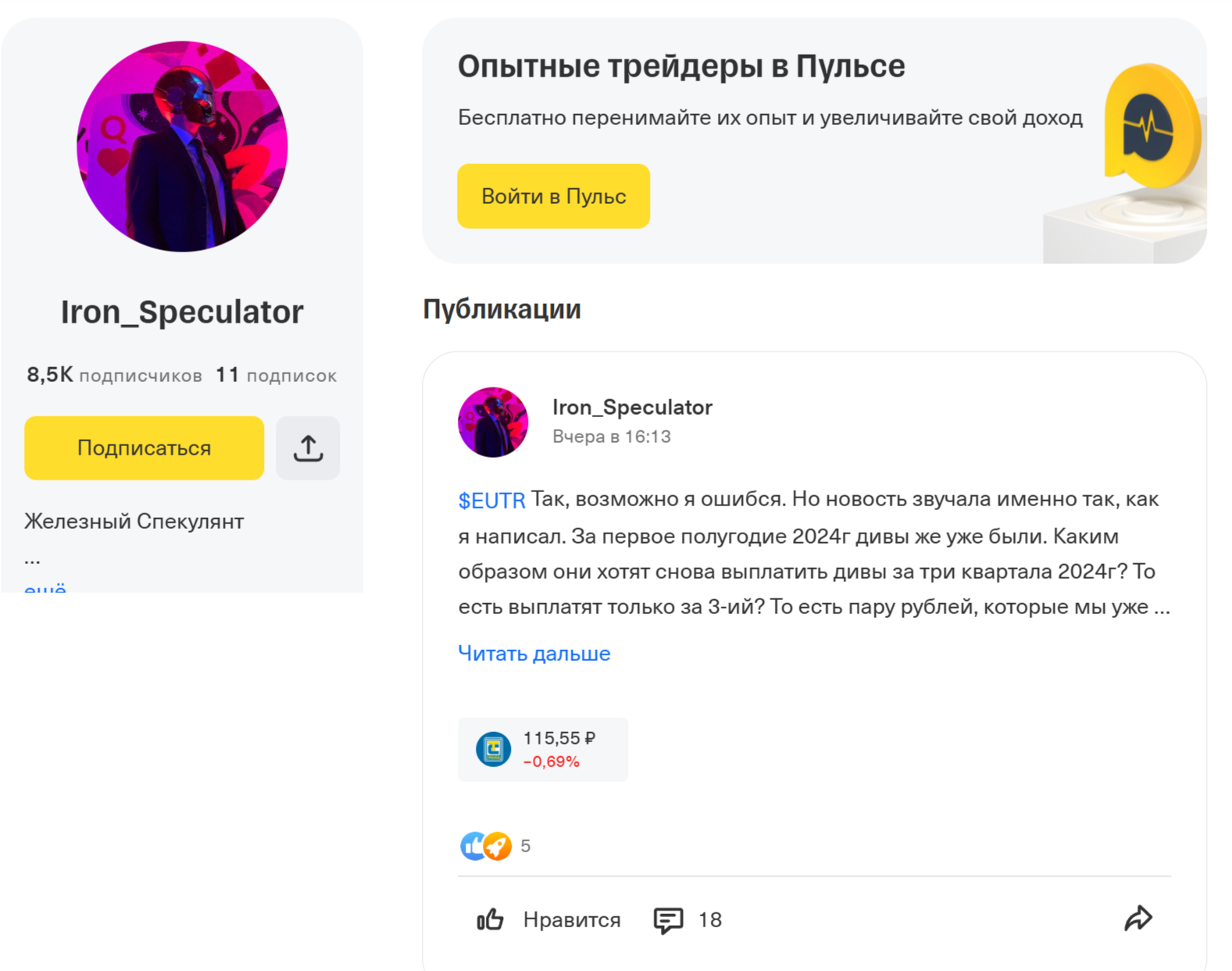 Профиль Iron Speculator на Пульсе весьма востребован, ведь к нему подписано около 8.5 тыс. пользователей. Здесь размещаются публикации, которые периодически появляются на рассмотренном выше канале Телеграм.