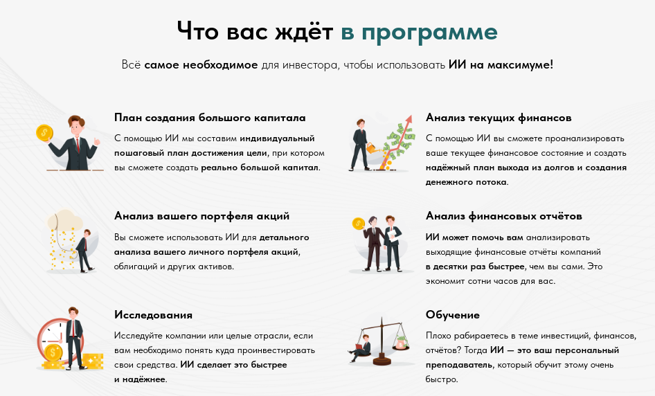 Учебный материал построен на ознакомлении студентов с ИИ, а точнее — с ChatGPT. Наставник говорит, что этот инструмент может помогать инвесторам и бизнесменам с любым уровнем опыта — от новичков до профи. Но это утверждение вызывает сомнения, ведь нет ни одного доказательства, что с его помощью кто-то действительно заработал миллионы на рынке.