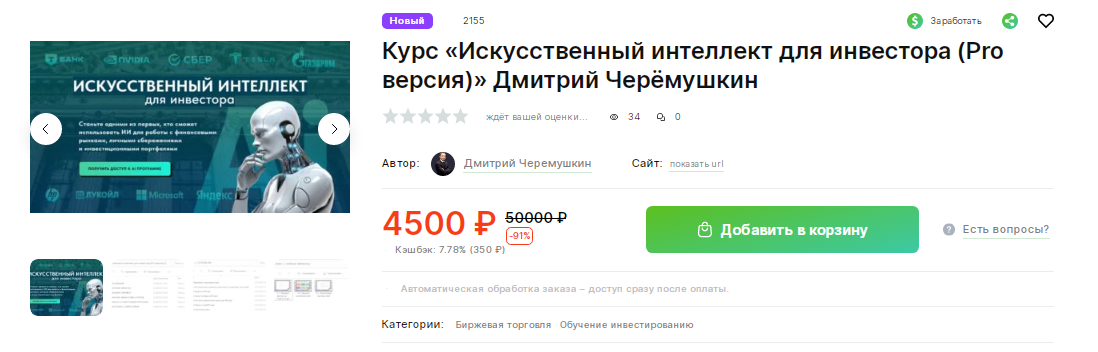 Получить лекции по теме «Искусственный интеллект для инвестора» от Дмитрия Черемушкина можно через образовательную платформу GetCourse. На начало августа 2025 года эти материалы доступны также для скачивания на портале Traderfond после оплаты 4500 руб. Ранее вебинар стоил 50 тыс. руб., но автор по каким-то причинам снизил цену. Возможно, его видеоуроки не пользуются таким спросом, как рассчитывал коуч.