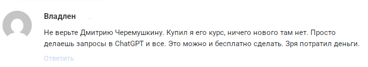 Его сайт wspro academy построен на популярной теме AI, которая сейчас активно используется маркетологами для создания искусственного ажиотажа. При этом объективных и независимых отзывов о курсе в сети практически нет. Под некоторыми публикациями в ТГ-канале автора встречаются негативные комментарии. Читатели ставят под сомнение профессионализм Дмитрия.