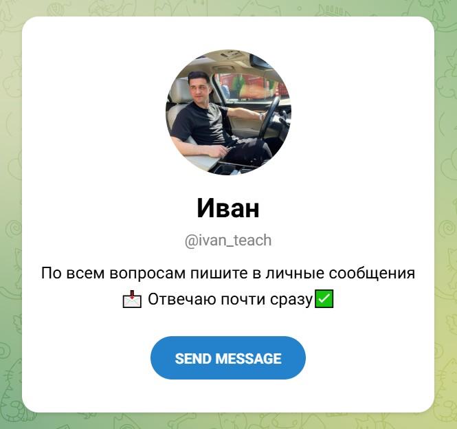 Ivan Teach – трейдер, который продвигает свои услуги по торговле криптовалютами. В Телеграме он создал канал, где можно получить информацию об его услугах. Также можно написать в личные сообщения, и автор подробно расскажет обо всем. Блогер обещает научить каждого клиента успешно совершать сделки с криптой с помощью специального бота, который автоматизирует процесс торговли.