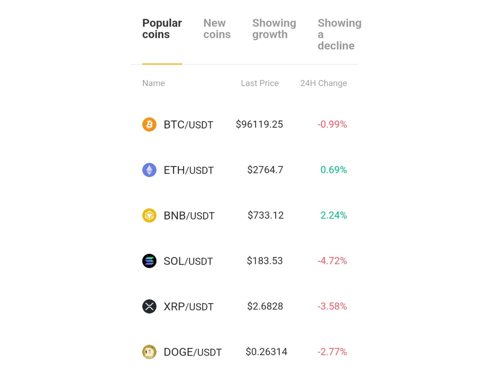 На площадке можно работать с такими криптовалютами, как: Bitcoin, XRP, Solana, Dogecoin, TON и другими.