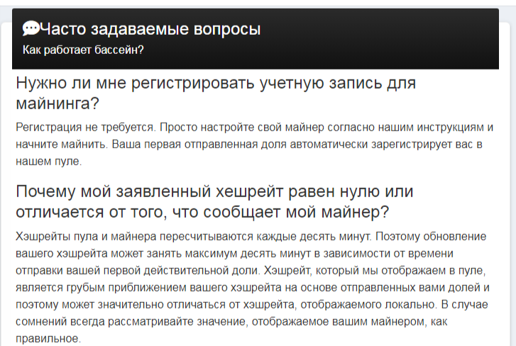 Также здесь оказался доступен раздел с ответами на вопросы. Так мы узнали, что создавать аккаунт на площадке не нужно. Достаточно начать майнинг по инструкциям сервиса JackPool Org и отправленная доля автоматически регистрирует пользователя в пуле.