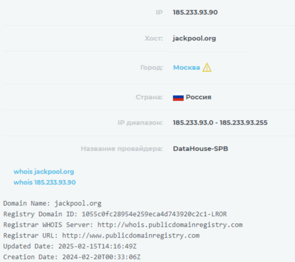 Дополнительно мы проанализировали домен Jack Pool и узнали, что запущен он был в феврале 2024 года в России. Но оригинальный язык сайта – английский.