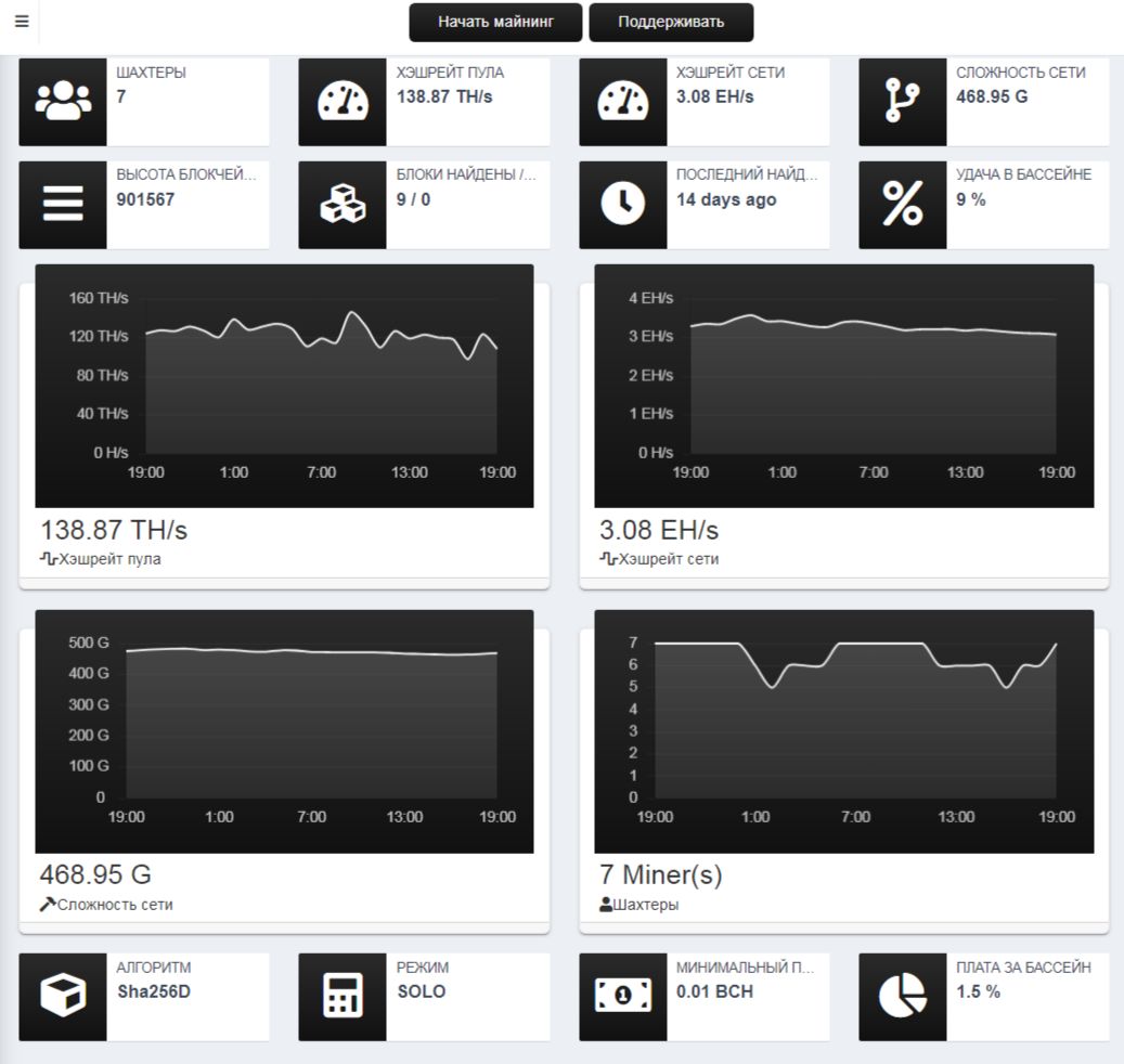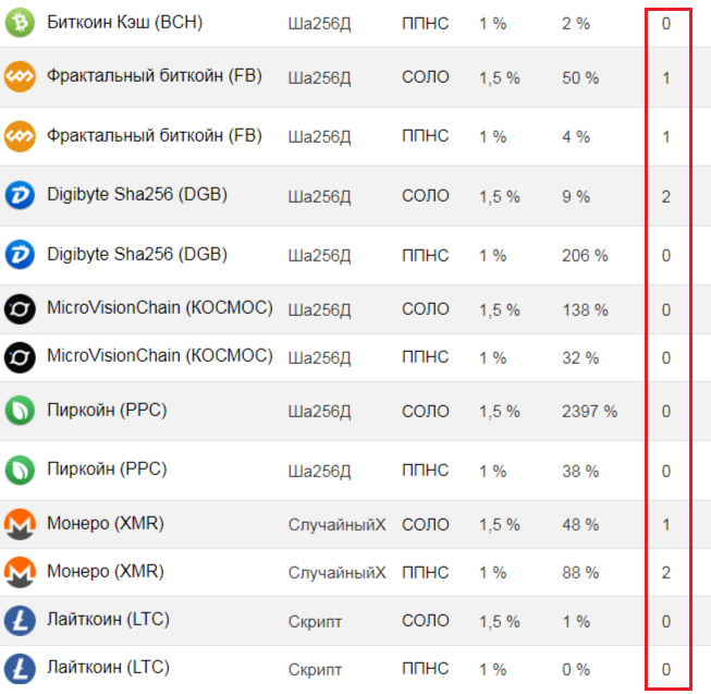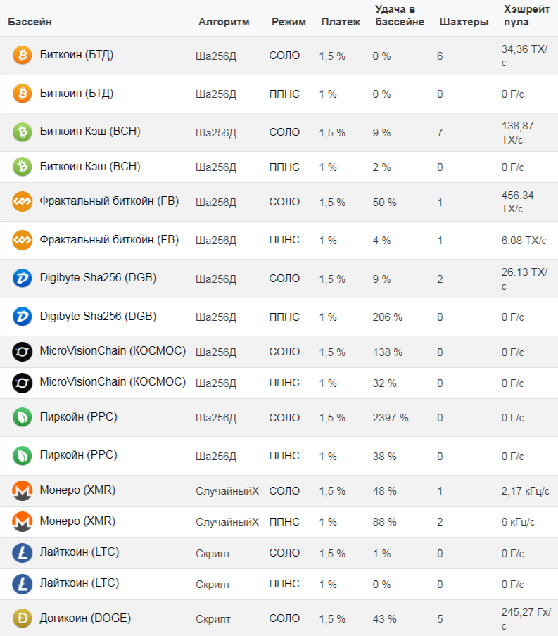 Мы заметили, что пул каждой криптовалюты дублируется. Это потому, что они подразделяются на SOLO с комиссией 1,5% и PPLNS с комиссией 1%. Всего для майнинга доступно 11 цифровых валют. Среди них указывались такие популярные как BTC, XMR, LTC и DOGE.
