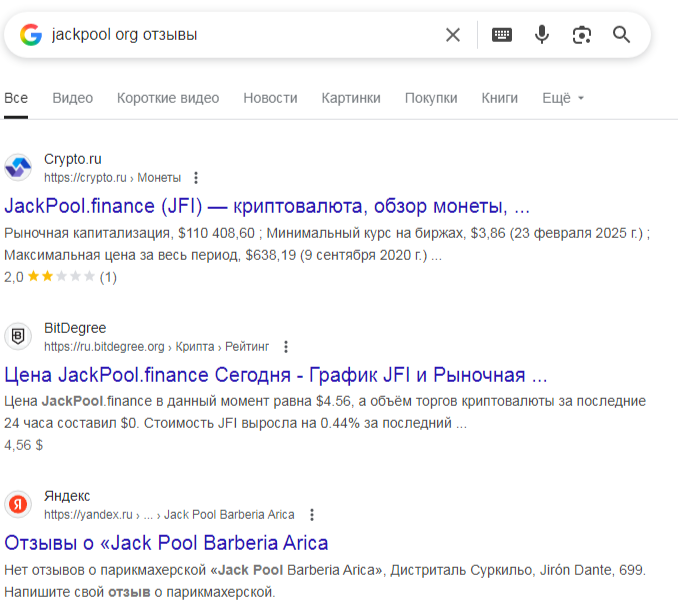 Только эти обещания доверия не вызывают, так как в работе проекта JackPool мы уже выявили множество недостатков. Чтобы узнать хоть что-нибудь о данной организации, мы решили изучить о ней информацию в поисковике. Но конкретно об этом ресурсе здесь нет никаких данных.