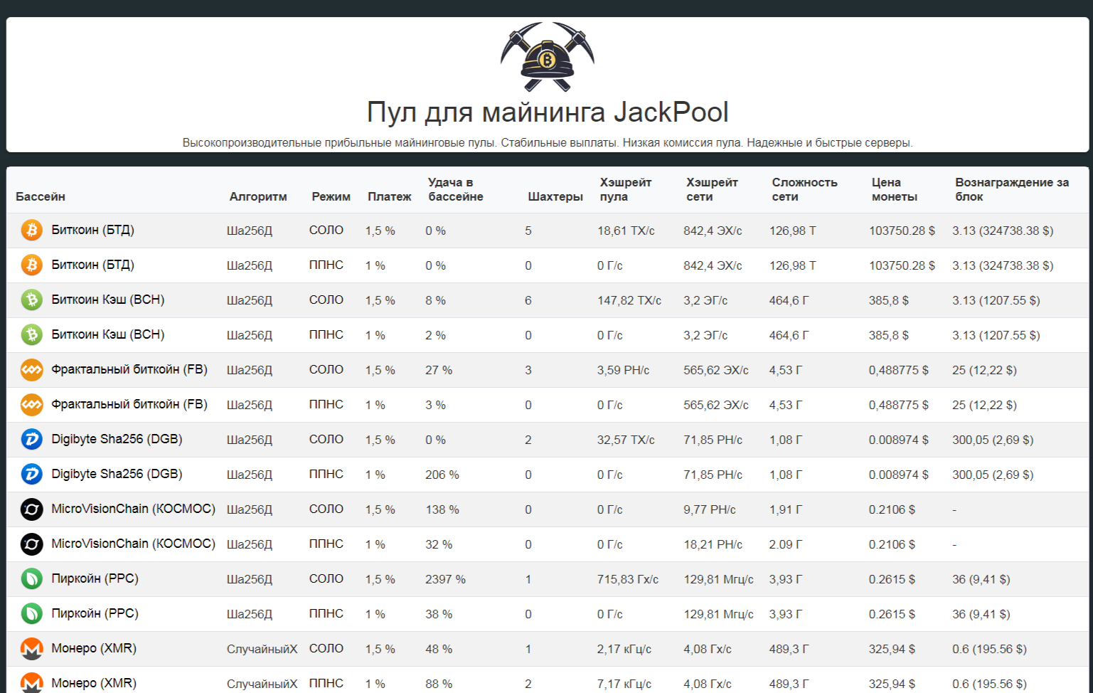 Все, что доступно посетителям сайта JackPool Org, это таблица с пулами и их характеристиками. Так, рядом с каждым пулом указывается:- алгоритм;
