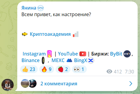 Одним из основных каналов является KimEraCrypto. В нем публикуются новости, личные рассуждения трейдера о сделках и ссылки с рекламой бирж. В октябре 2024 года к нему проявляет интерес чуть менее 3 тыс. человек, но посты просматривает далеко даже не половина из них.