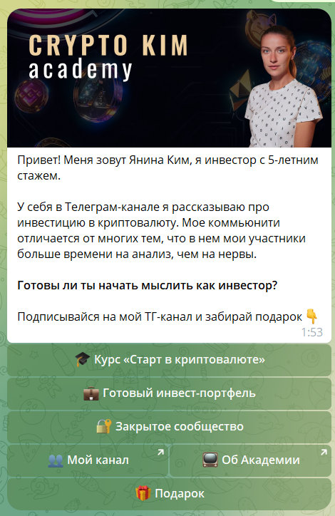 Для удобства пользователей трейдер создала бота Kim Academy Bot. Он знакомит новых клиентов с краткой биографией автора и предлагает воспользоваться платными и бесплатными услугами блогера.Для связи у блогера есть профиль Yanina Million. На нем нет никаких ссылок, а информация о последнем посещении мессенджера пользователем отсутствует.