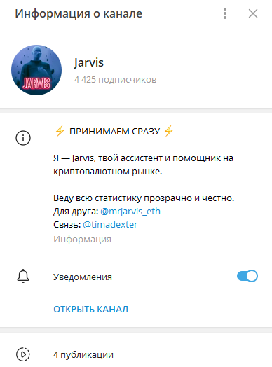 Джарвис – Телеграм-канал с 4400 подписчиками. Паблик функционирует с 2022 года. У трейдера есть также лента Mrjarvis Eth, где рекламируется основной канал. А также есть личный чат Timadexter, где пользователи могут связаться с автором проекта. Его зовут Tim. Плюс спекулянт ведет Ютуб-канал Jarvis Crypto Trade с 590 подписчиками.