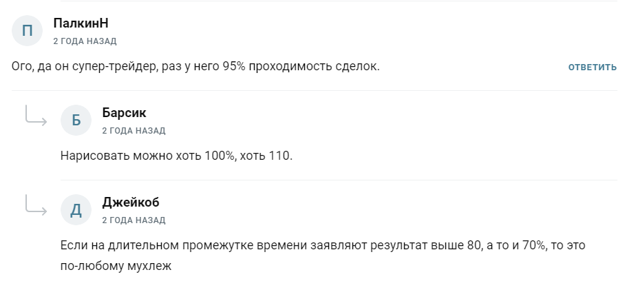 В открытых источниках есть негативные отзывы об этом проекте. Подписчики канала критикуют проходимость сигналов. Они уверены, что те результаты, которые демонстрирует трейдер – фейк.