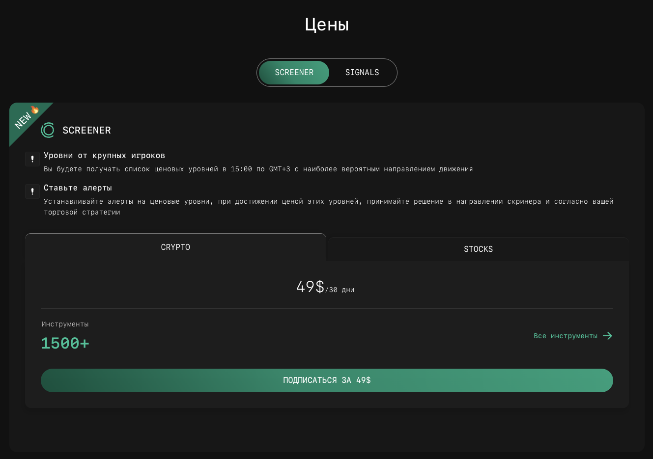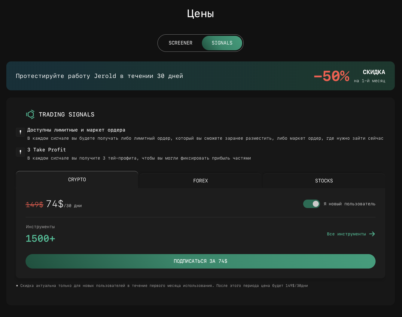 Другой продукт – это торговые сигналы. Его стоимость начинается с 74 долларов в месяц. Данная система выдает лимитные ордеры.