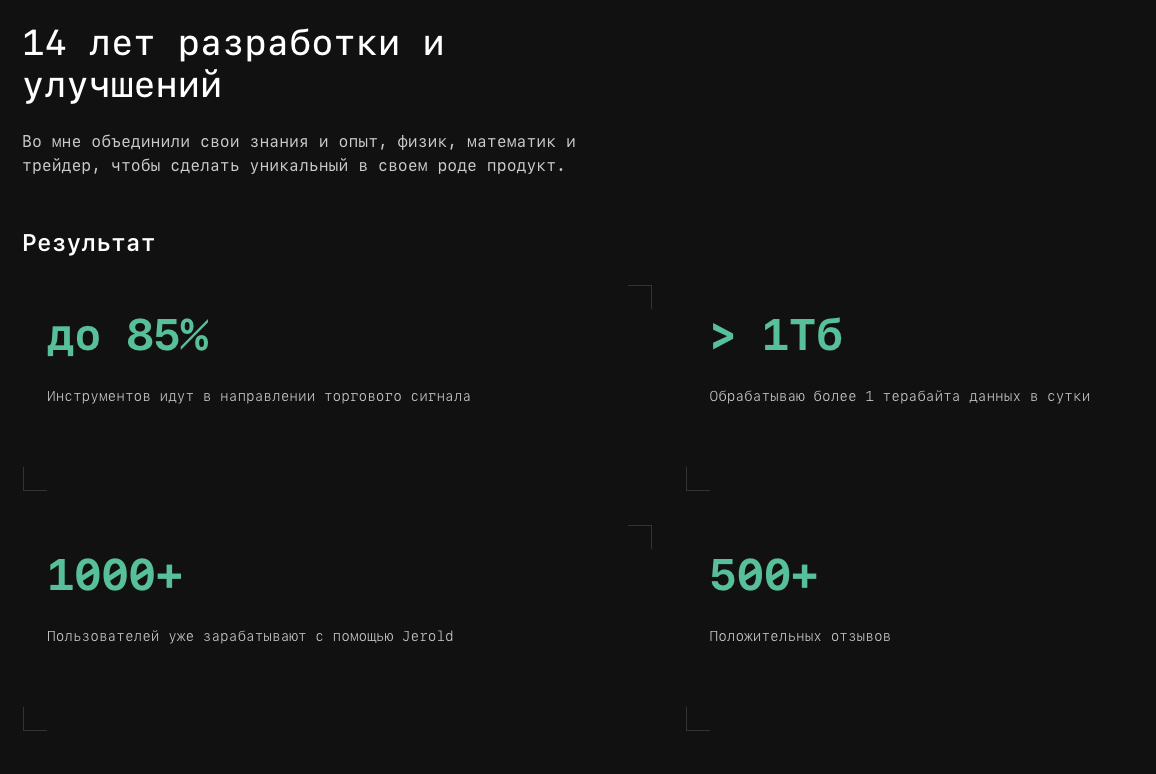 На официальном сайте проекта «Джерольд», jerold io сообщается, что результативность применения соответствующего инструмента достигает 85%. Это возможно благодаря анализу 1 терабайта торговых данных ежедневно. Также упоминается, что системой уже пользуется свыше 1 тысячи человек. Правда, ни одному из указанных утверждений не приводится никаких доказательств.