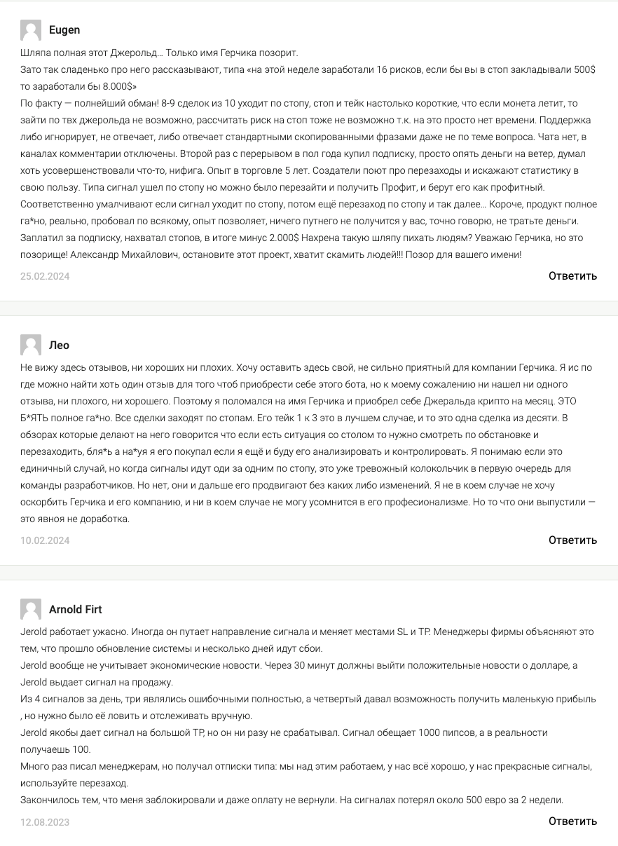 Зато негативных отзывов о боте Jerold очень много. Пользователи утверждают, что обещанной прибыли при использовании данного ПО они не заработали.
