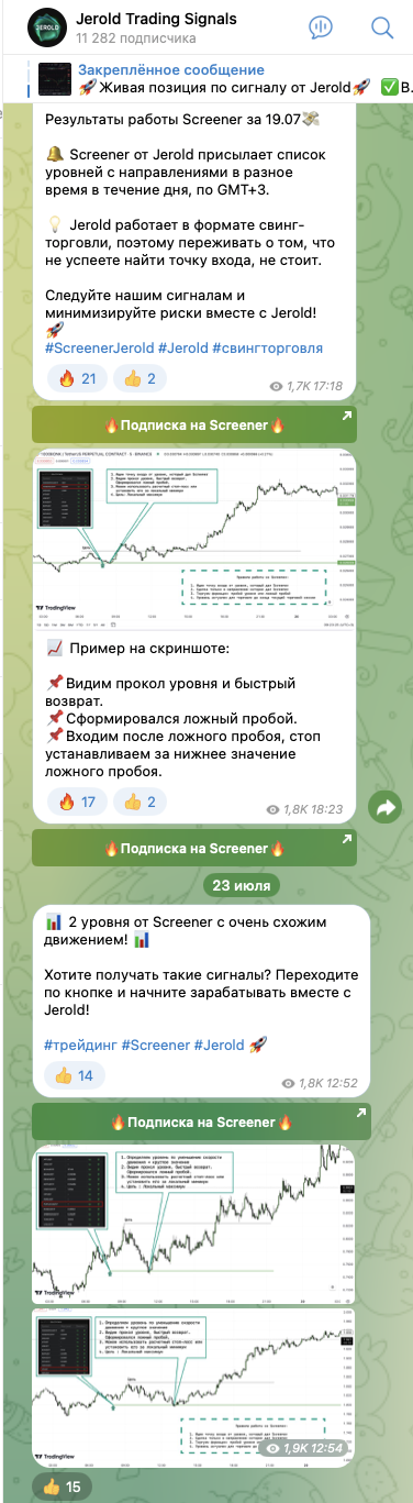 На официальный аккаунт проекта в Телеграм – канал Jerold Trading Signals, на 29 июля 2024 года, подписано свыше 11,2 тысяч пользователей. А среднее количество просмотров публикаций, в свою очередь, составляет всего 1,5-1,7 тысяч раз.