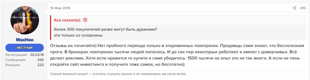 Другие говорят о чрезвычайной простоте программы, которая, по сути, никакого нового инструмента в руки пользователя не дает. Но трейдеры признают гениальность разработчиков, которые поднимают хорошие деньги ни за что.