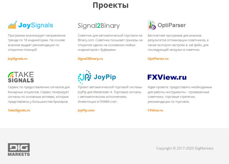 Программа для трейдинга joy signals была разработана в 2017 году группой трейдеров-программистов, которые назвали себя Digmarkets. Наряду с joysignals было еще 5 продуктов Digmarkets, которые сейчас не функционируют.