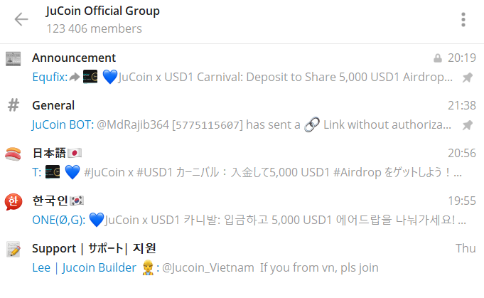Проект в Телеграмм существует под юзернеймом JucoinEx. У Jucoin есть более 120 000 участников и 5 отдельных чатов. Два из них предназначены для пользователей из Японии и Южной Кореи. Есть чат с анонсами и новостями, генеральный чат проекта и служба поддержки.