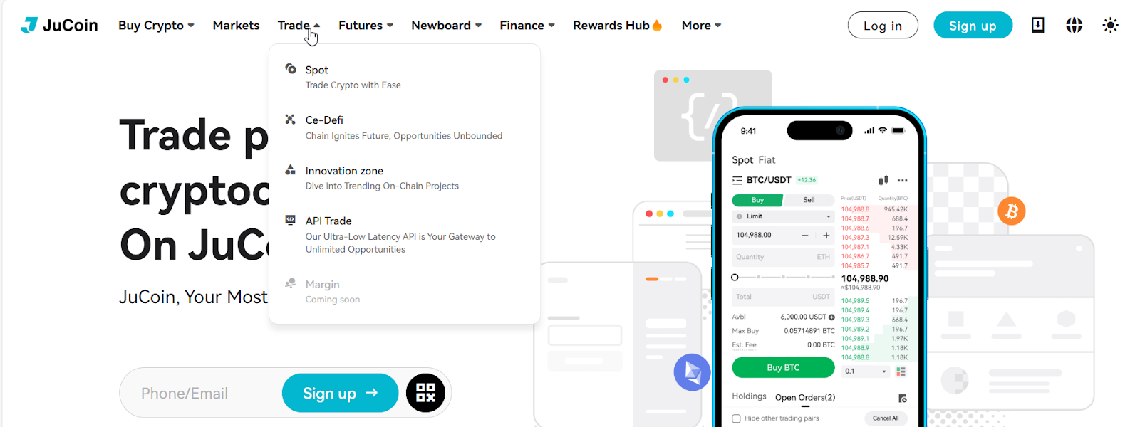 У сайта есть множество разветвлений и функций. Например, трейдингом можно заниматься разными способами: спотовой торговлей, с помощью системы Ce-DeFi, участвовать в торговле ончейн на Ju Coin, использовать автоматизированную стратегию API. Похожий подход применяется и к покупке криптовалют, который можно осуществить по схеме C2C или с помощью Lighting by crypto – системе, которая снижает комиссии и позволяет удобно переводить активы.