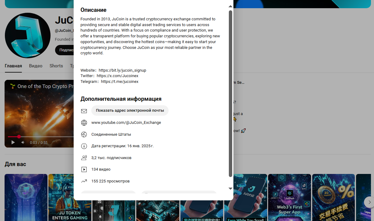 На YouTube канал Jucoin существует с 16 января 2025 года. Регистрация прошла на территории США. С тех пор бирже удалось собрать чуть больше 3 000 подписчиков, 155 225 просмотров за 134 видео. Преимущественно ролики от организации публикуются в формате Shorts.