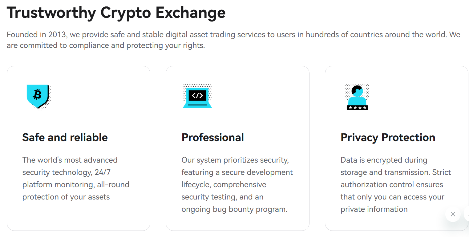 На основном сайте есть раздел, в котором биржи представляется надежным посредником, работающим с 2013 года. Авторы обещают безопасность, которая обеспечена круглосуточным мониторингом, передовыми технологиями и защитой активов. Защита конфиденциальности позволяет гарантировать, что никто не сможет получить чужие личные данные, а профессиональные сотрудники тестируют платформу и разрабатывают системы защиты.