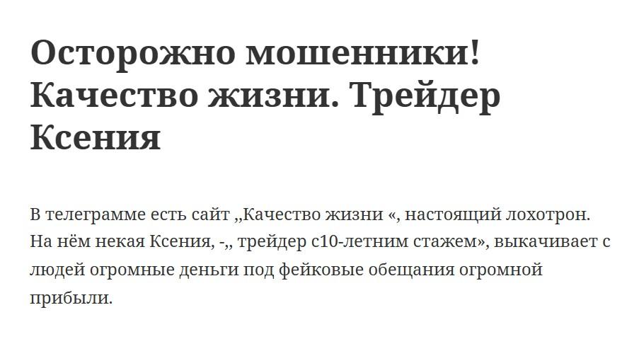Телеграм-канал «Качество жизни» на момент написания обзора найти не удалось. Вероятно, он удален. Информации о нем в сети тоже нет. Есть только жалоба, в которой человек рассказал, что в этой группе девушка по имени Ксения обманывает людей на деньги. Она представляется трейдером с 10-летним опытом, обещает быстрый и легкий заработок на криптовалютах, но в итоге доход не выплачивает.