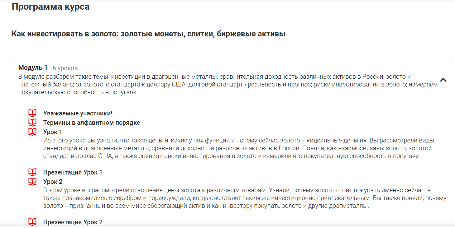 Программа охватывает все: от истории этого металла до современных доходностей, налогов, рисков и тонкостей различных инструментов: металлические счета, фонды, контракты и ценные бумаги. В теории все подано наглядно: презентации, тесты, подробные объяснения, как выбирать инвестиционные активы и не заблудиться среди графиков и цифр.