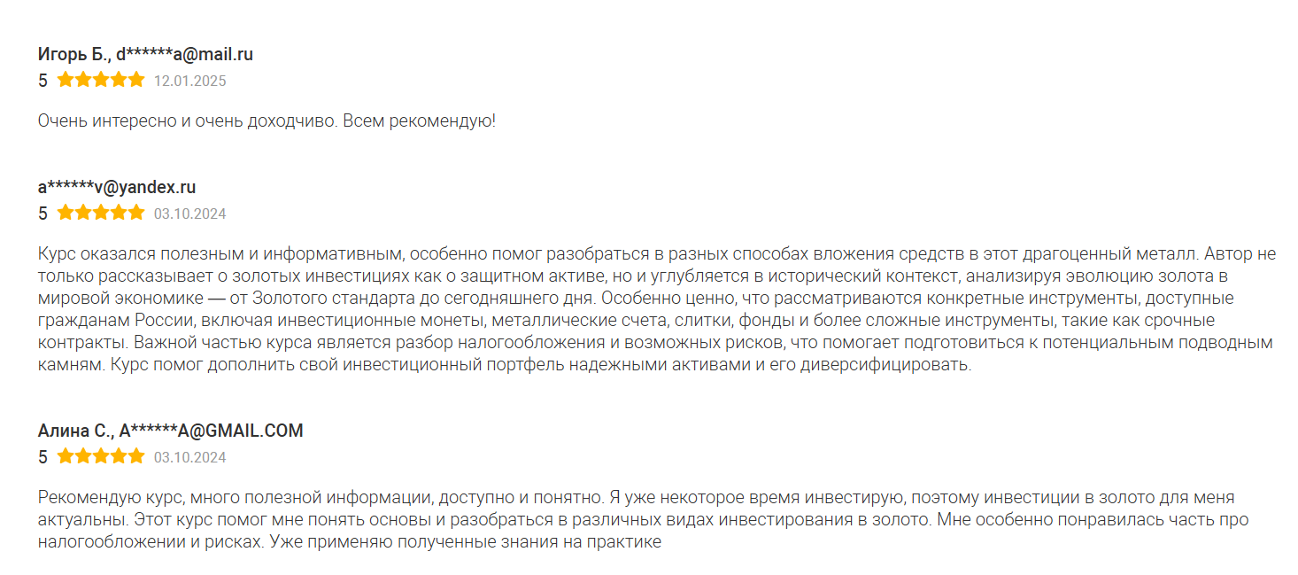 Отзывы на сайте Школы исключительно положительные: участники хвалят курс за доходчивость, информативность и подробное объяснение инструментов инвестирования в золото.