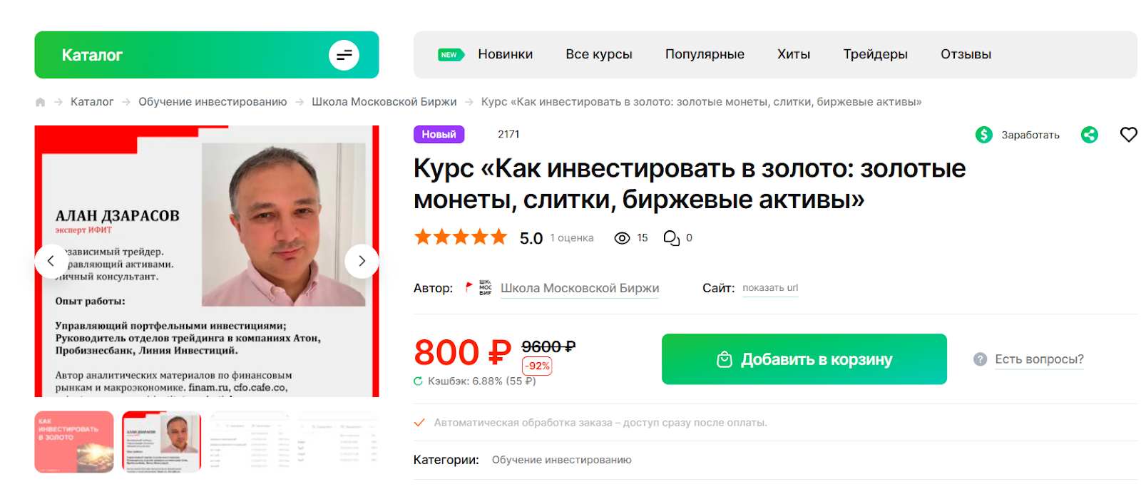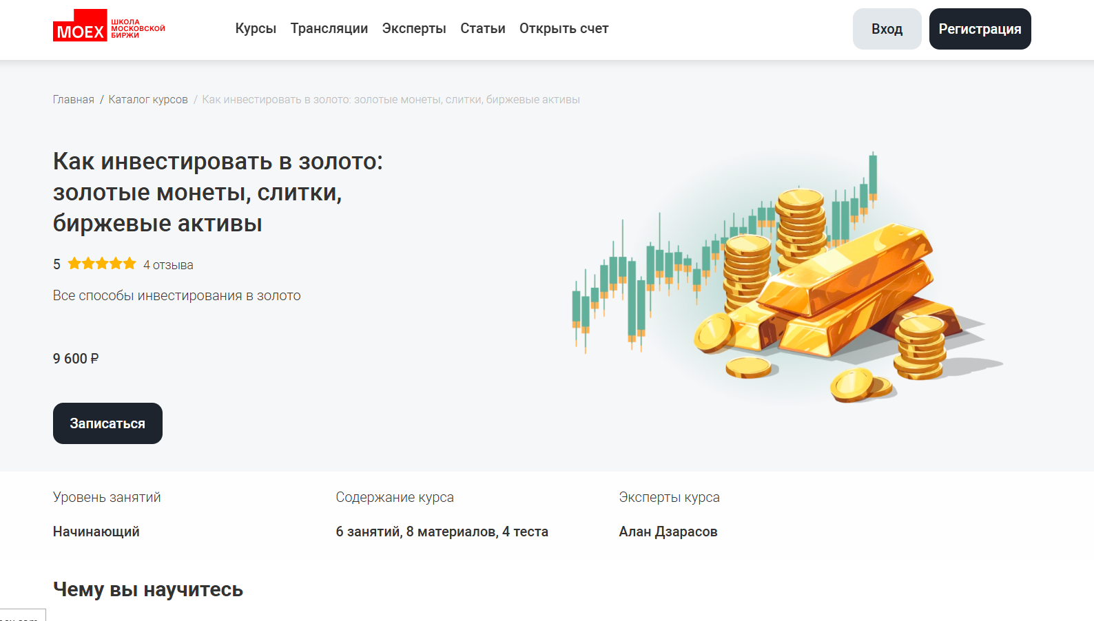 На официальном сайте курс стоит 9600 рублей, включает шесть уроков, восемь блоков и четыре теста. Он рассчитан на новичков, которые хотят понять, как дружить с золотом и не заблудиться в мире инвестиций.