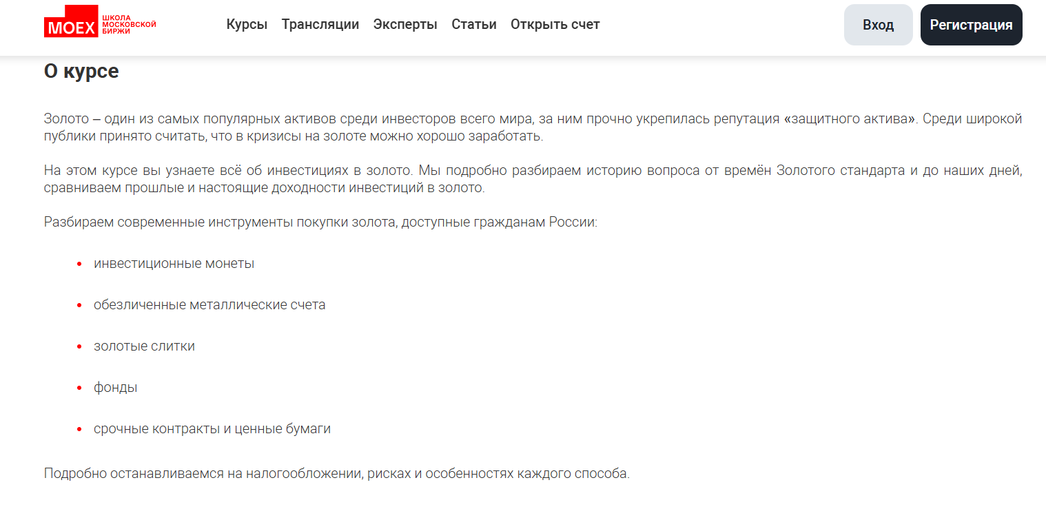 “Как инвестировать в золото Школа Московской Биржи” курс: стоит ли покупать?