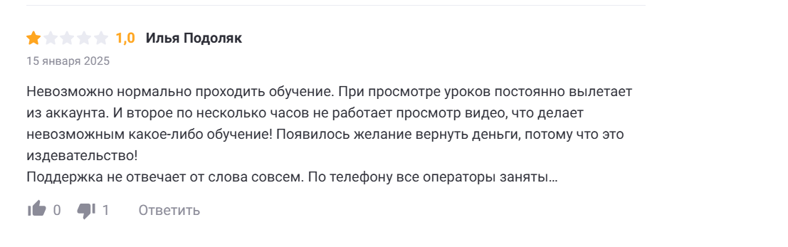 Один из самых резких отзывов оставил один из клиентов в независимом источнике: по его словам, уроки постоянно вылетают, видео не работают по несколько часов, поддержка не отвечает, и у него появилось желание вернуть деньги.