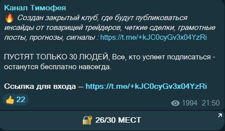 Админ продвигает закрытый клуб, где обещают публиковать эксклюзивную информацию от других трейдеров, точные сделки на бирже, эффективные прогнозы и сигналы для торговли. Стоимость доступа не указана, но есть якобы 30 бесплатных мест.