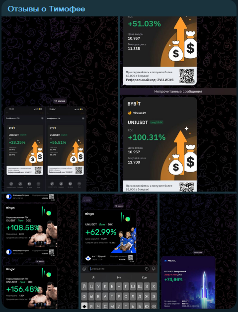 Трейдер собирает все отзывы о торговле по его рекомендациям на отдельном телеграмм-канале с ником Otzivi O Timofee. Там все положительные отзывы размещены в формате скриншотов переписки со своими довольными клиентами.