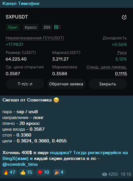 Во всех постах, где админ показывает скриншоты по сделкам он дает свою реферальную ссылку на биржу BingX. Плюс в таких постах он сообщает о том, что совместно с биржей дарят по 500-2000 долларов за торговлю на ней.