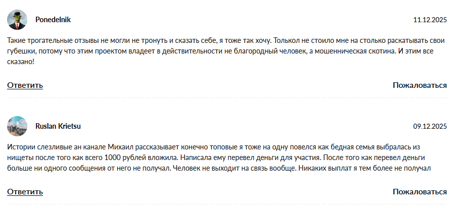 Отзывов о данном проекте в ТГ на различных тематических сайтах практически нет. Упоминаний тоже всего несколько и всегда это разоблачительные обзоры с обвинениями в мошенничестве. О том же пишут и рядовые пользователи в комментариях.