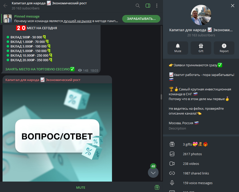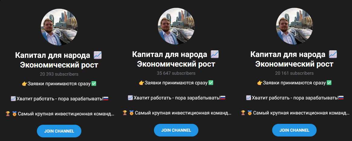 Важно сразу отметить, что это не единственный Телеграмм-канал с таким названием, фотографией и контентом. Речь о целой сетке ресурсов, принадлежащей одной группе лиц. Для их продвижения они используют манипуляции, спам, нереалистичные обещания, давление (например, «осталось всего два места») и так далее.