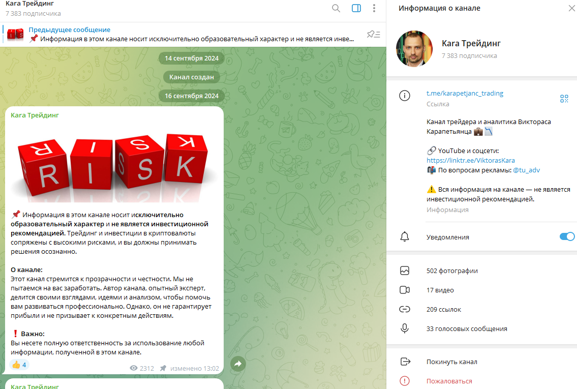 Тг-канал Kara Трейдинг был запущен в ту же дату, что и основной – 16 сентября 2024 года. На нем публикуются сигналы для форекс рынков. Но насколько они безопасны – неизвестно, ведь автор не приводит никаких подтверждений заявленному опыту.