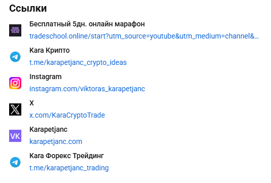 Автор веет несколько социальных сетей. Основная деятельность сосредоточена на Тг-каналах Kara Крипто (karapetjanc crypto ideas), Kara Трейдинг, а также на Ютуб-канале Kara Trading.