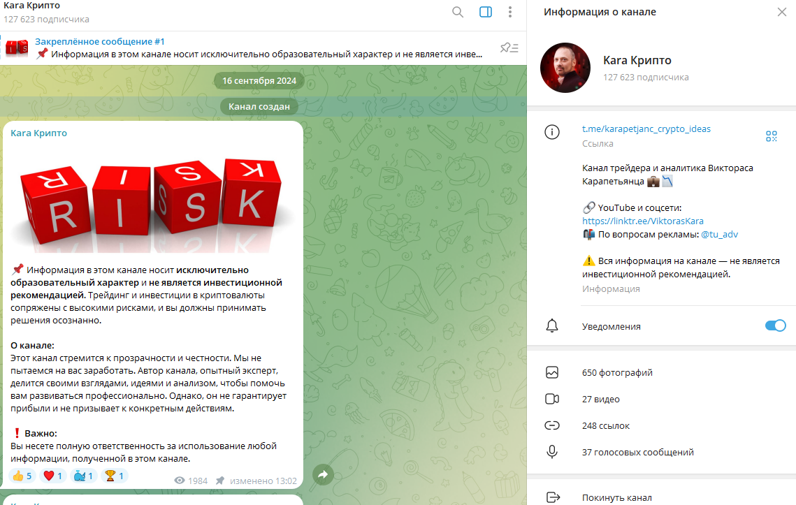 Kara Крипто – Тг-канал, созданный якобы успешным трейдером и аналитиком Викторасом Карапетьянцом. Автор утверждает, что он на рынке с 2000 года, за долгое время работы освоил основы технического и фундаментального анализа. Мы провели проверку проекта, чтобы узнать, насколько безопасно сотрудничать с данным экспертом.