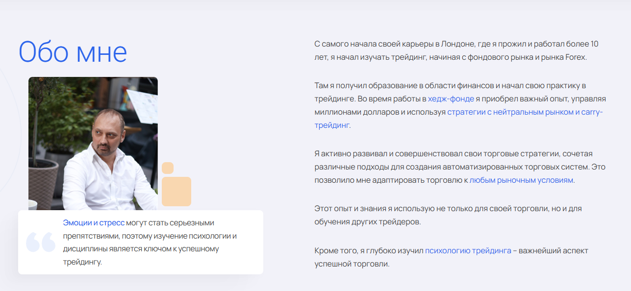 У автора есть персональный сайт – karapetjanc com. Не до конца ясно, с какой целью он был создан, ведь при написании обзора автор не продвигает платных услуг. В разделе Обо мне автор рассказывает, что более 10 лет он работал в Лондоне, проработал в хедж-фонде, развивал свои навыки в трейдинге. Но опять же, нет никаких подтверждений этой легенде. Автор даже в двух словах не рассказал о хедж-фонде, не привел никаких доказательств своего опыта.