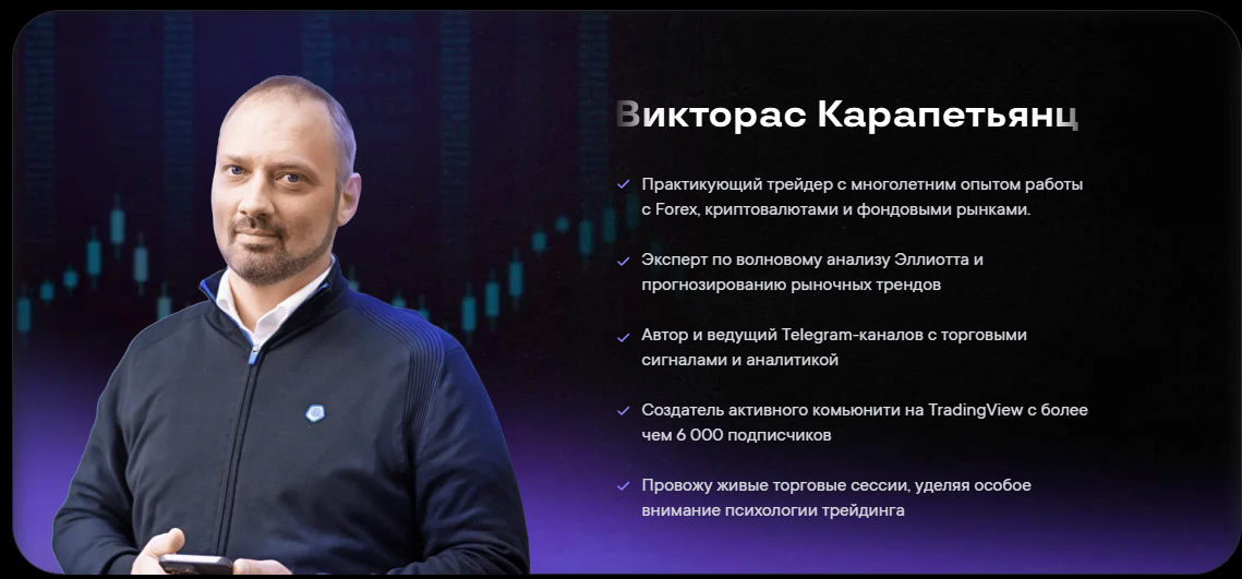 Интенсив ведется совместно с другим гуру, в разделе о Викторасе указано, что он не только опытный трейдер, но и основатель большого комьюнити на TradingView.